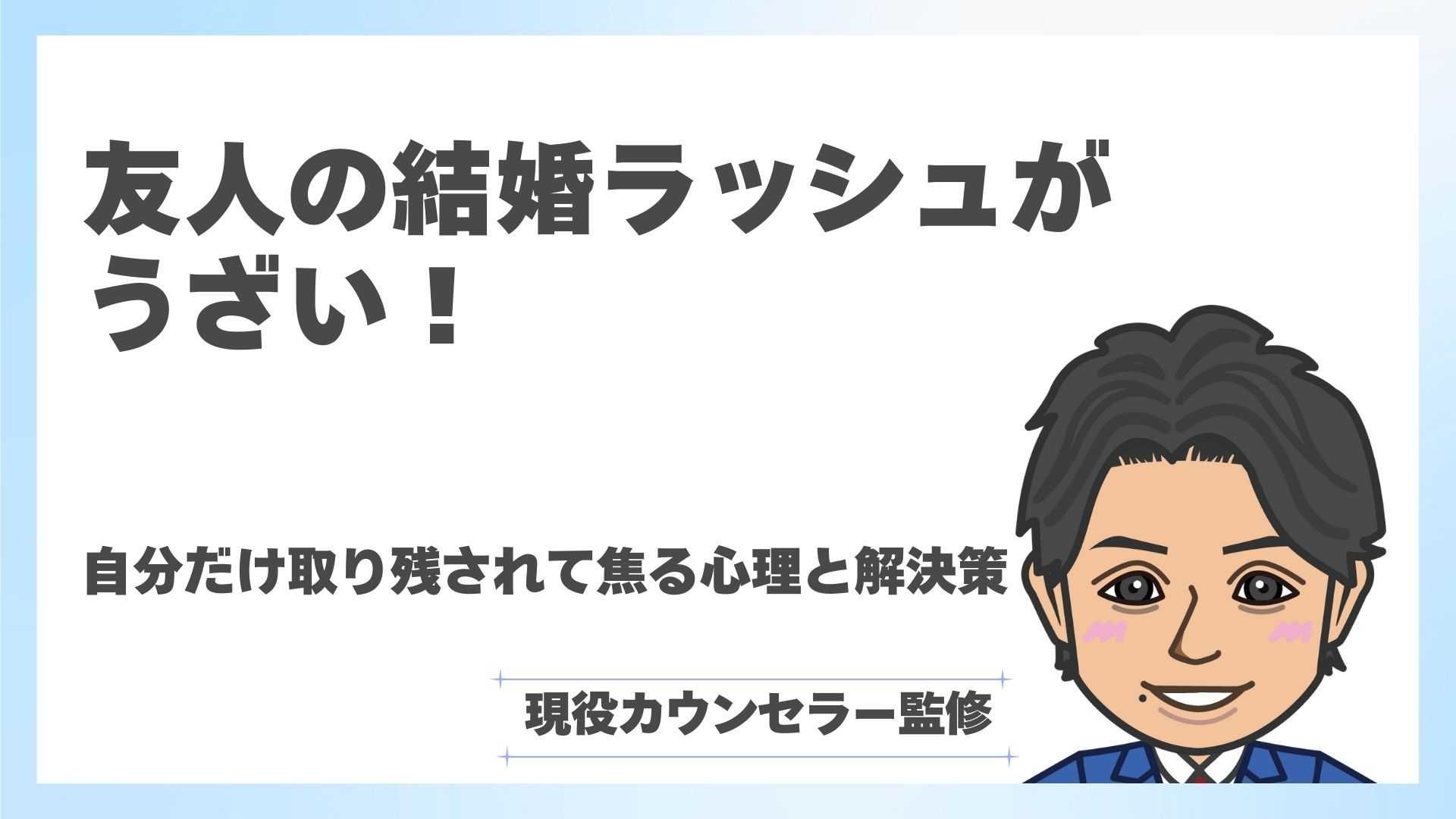 周りの友人が次々と結婚していく「結婚ラッシュ」に、「正直うざい…」と感じていませんか?「 「自分だけ取り残された」「早く結婚しなきゃ」と焦る気持ち、よく分かります。 この記事では、あなたがなぜそう感じるのか、その複雑な心理を紐解き、具体的な解決策や気持ちの切り替え方をお伝えします。 結婚ラッシュの時期や、先に結婚した友人の「うざい発言」への対処法、そしてもし「私も結婚したい!」と感じた時の具体的な婚活方法まで、あなたの悩みに寄り添いながら解説します。 結婚ラッシュがうざいと感じ... -