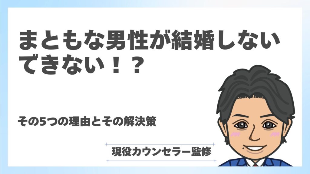 「自分はまともなはずなのに、なぜか結婚できない…」そう悩む男性は少なくありません。 真面目さや優しさが、かえって婚活の壁になっているケースを、私は結婚相談所の仲人として数多く見てきました。 この記事では、あなたが結婚しない(できない)と感じる5つの意外な理由と、まともな男性が幸せな結婚を掴むための具体的な解決策をお伝えします。もう悩むのは終わりにして、理想のパートナーを見つけましょう! まともな男性ほど結婚しない・できない5つの理由 最近では、まともな男性ほど結婚しない・できない... -