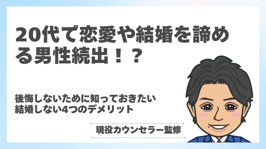 「20代で結婚を諦める」そう考えているあなたへ。 金銭的な不安、仕事の忙しさ、過去の経験…様々な理由で恋愛や結婚に踏み出せない気持ち、よく分かります。 しかし、本当にこのままで後悔しませんか? この記事では、あなたが結婚を諦める本当の理由を深掘りし、結婚しないことで直面する意外なデメリット、そして後悔しないための具体的な一歩を提案します。 まだ20代、諦めるのはまだ早いかもしれません。一緒に新しい人生設計を考えてみませんか? 20代男性で恋愛や結婚を諦める人が増加傾向 近年、20代の男性... -