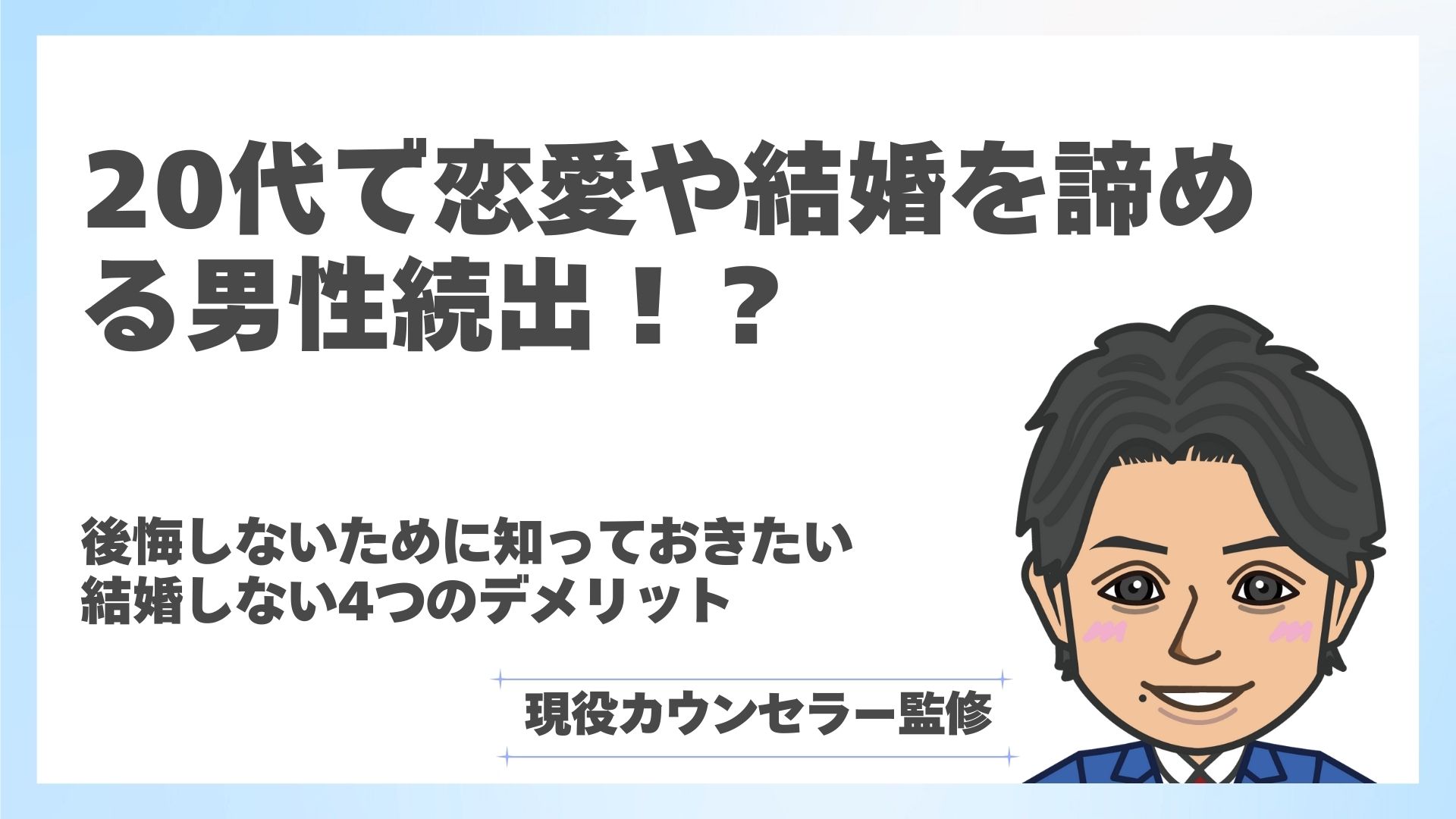 20代で恋愛や結婚を諦めてしまう男性が増えているという悲しい現状があります。たしかに、金銭的な不安や仕事の忙しさ、過去の経験からくるコンプレックスなど、様々な理由があることはよく分かります。